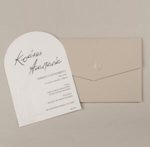 Προσκλητήριο γάμου με μοντέρνο κοπτικό σε σχέδιο καμάρας