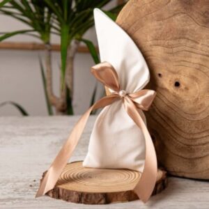 Υφασμάτινο πουγκί μπομπονιέρα γάμου με σατέν δέσιμο και πέρλα