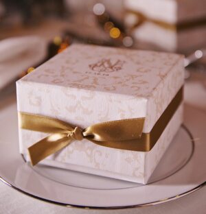 Μπομπονιέρα γάμου τυπωμένο κουτί με σατέν δέσιμο