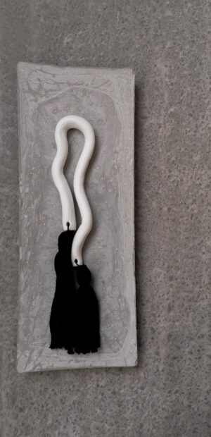 Minimal πήλινη χειροποίητη μπομπονιέρα γάμου με ασύμμετρο σχήμα και διακοσμητική φούντα