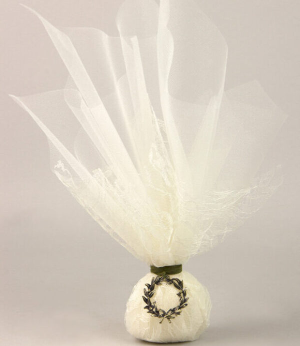 Αριστοκρατική μπομπονιέρα γάμου με ιβουάρ δαντέλα και μεταλλικό στεφανάκι ελιάς