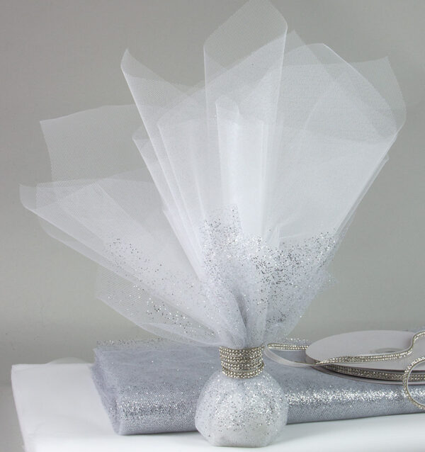 Εντυπωσιακή ασημί μπομπονιέρα γάμου με τούλι strass και λαιμό από μεταλλική κορδέλα με κρυσταλλάκια