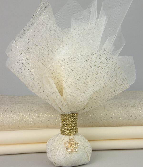 Εντυπωσιακή μπομπονιέρα γάμου με τούλι strass και χρυσό κορδόνι με μεταλλικό αξεσουάρ