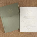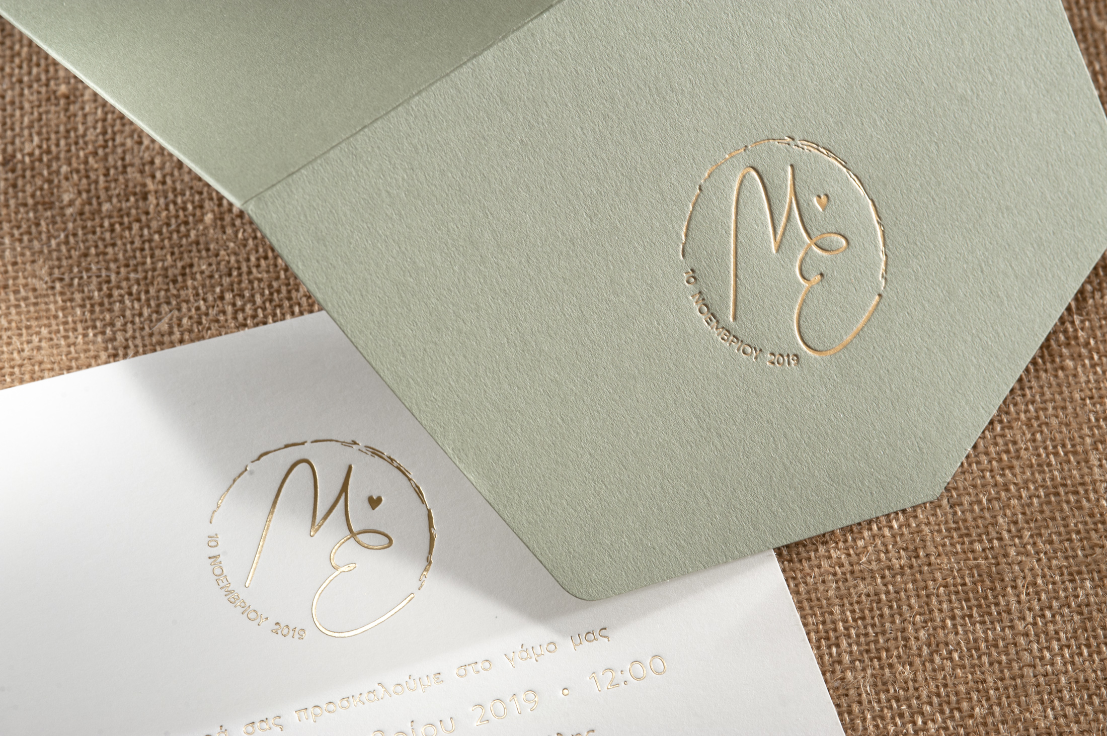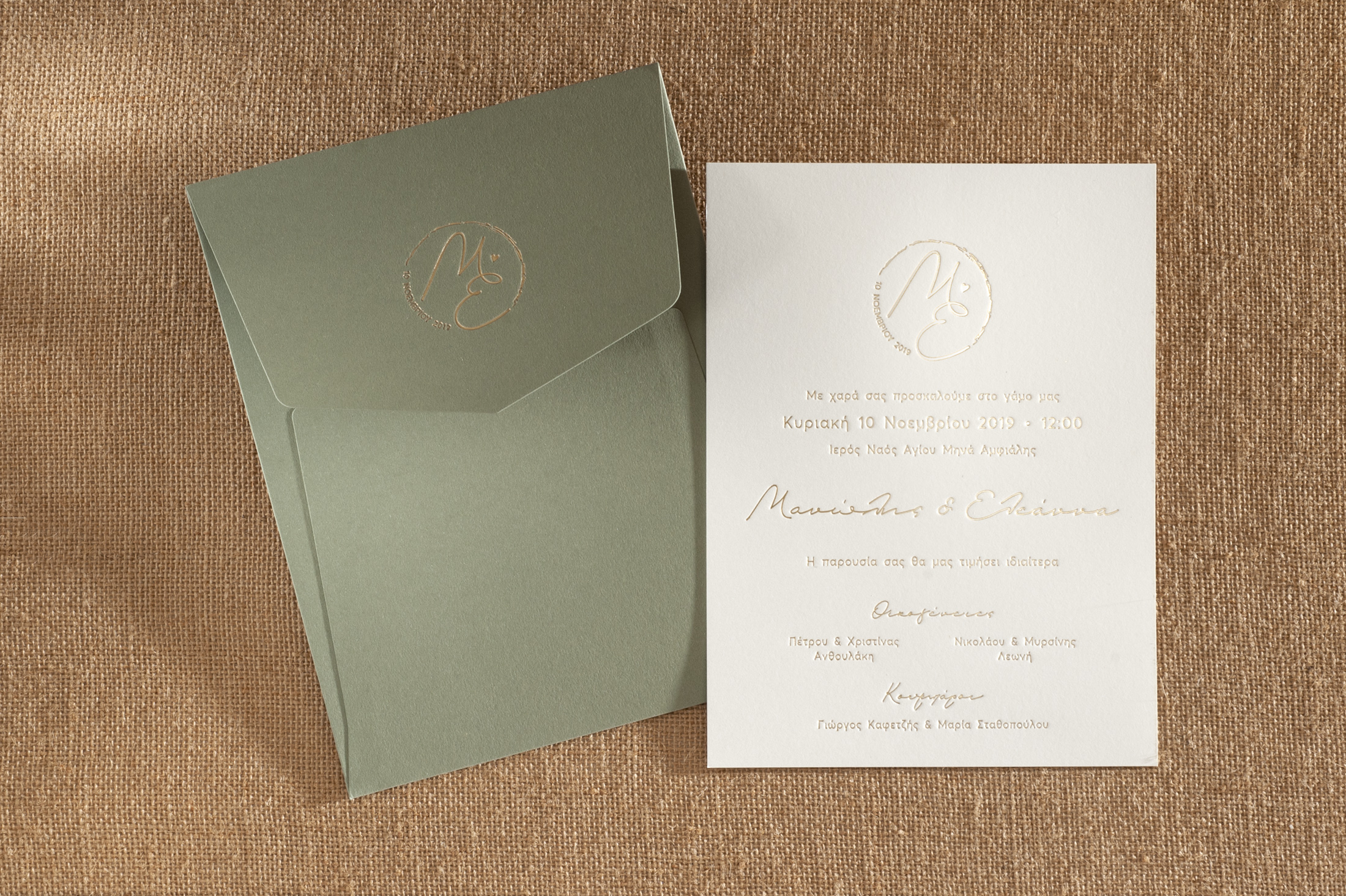 Κομψό προσκλητήριο γάμου σε λαδί απόχρωση και ιδιαίτερα μονογράμματα.