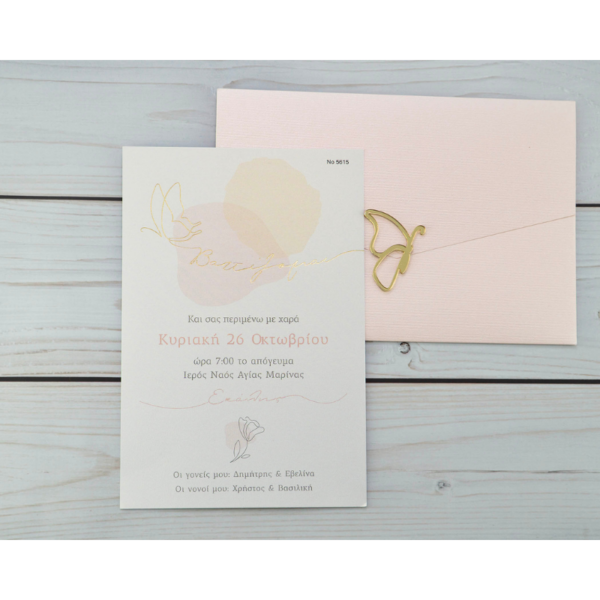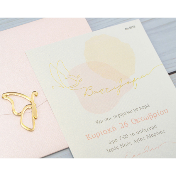 Μοντέρνο προσκλητήριο βάπτισης με θέμα την πεταλούδα και χρυσό plexi glass στο φάκελο