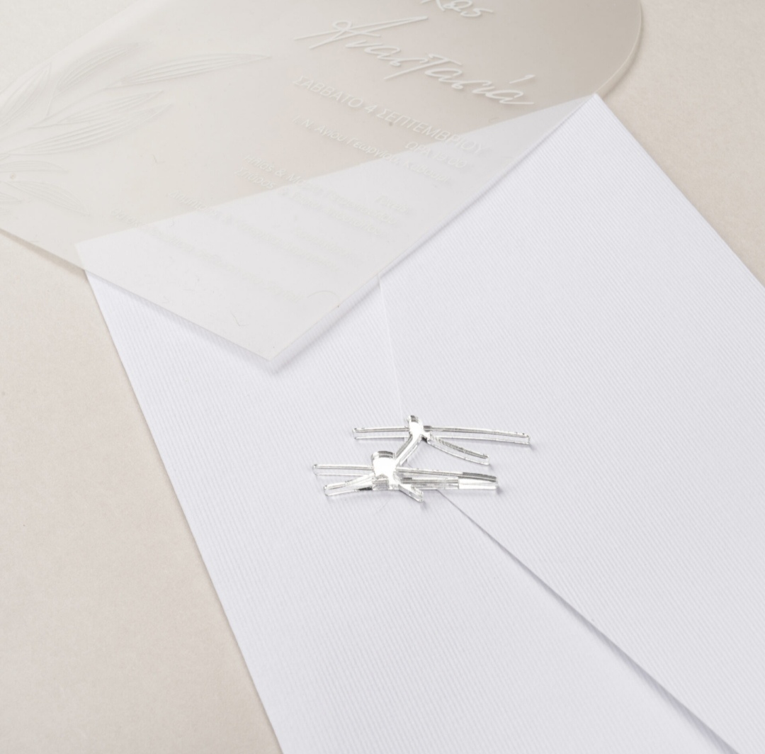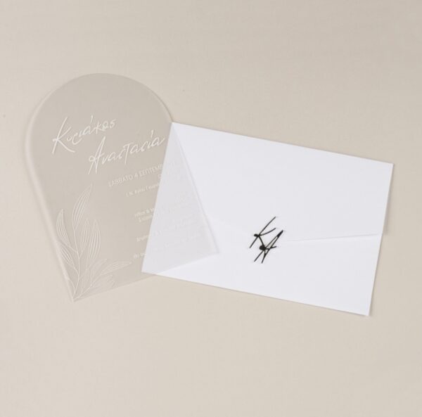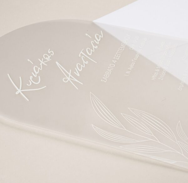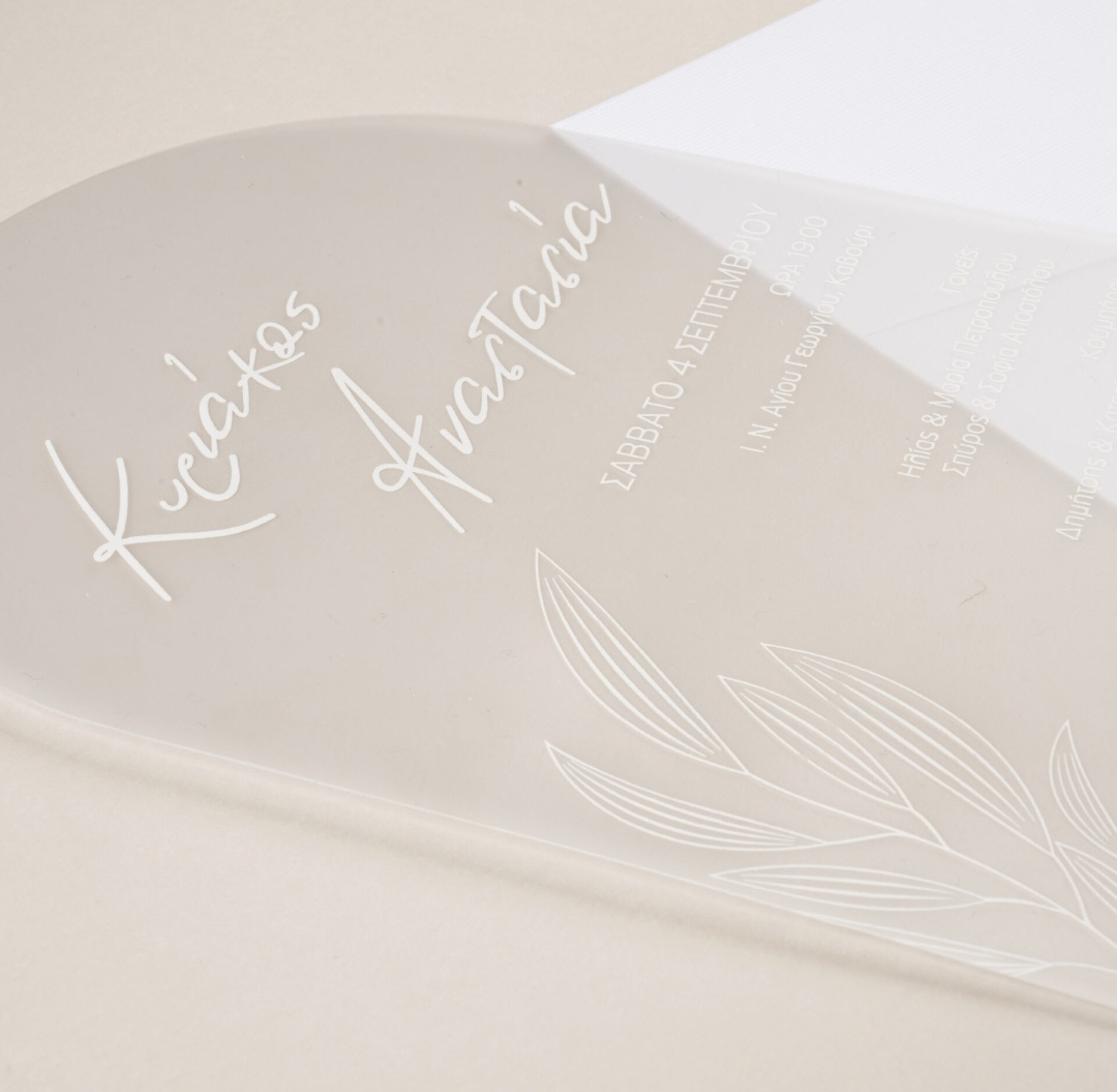 Μοντέρνο προσκλητήριο γάμου με διαφάνεια και plexi glass διακοσμητικό στοιχείο