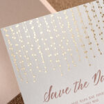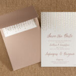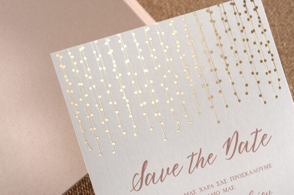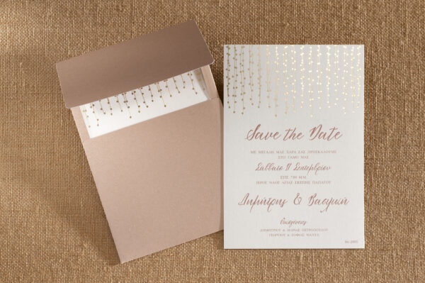 Μοντέρνο προσκλητήριο γάμου με ιδιαίτερο εικαστικό τύπωμα σε χρυσοτυπία και nude φάκελος.