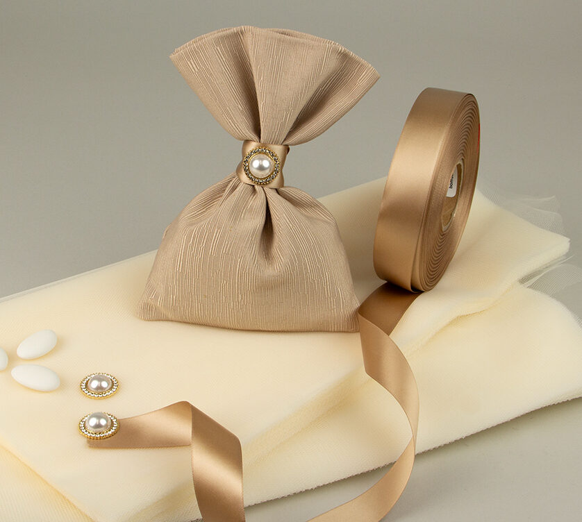Μπομπονιέρα γάμου μεταξωτό πουγκί με σατέν δέσιμο και πέρλα