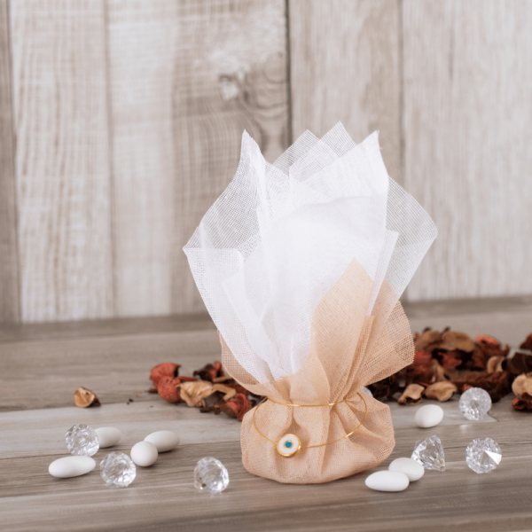 Μπομπονιέρα γάμου με γάζα σε γήινη απόχρωση και μεταλλικό στοιχείο