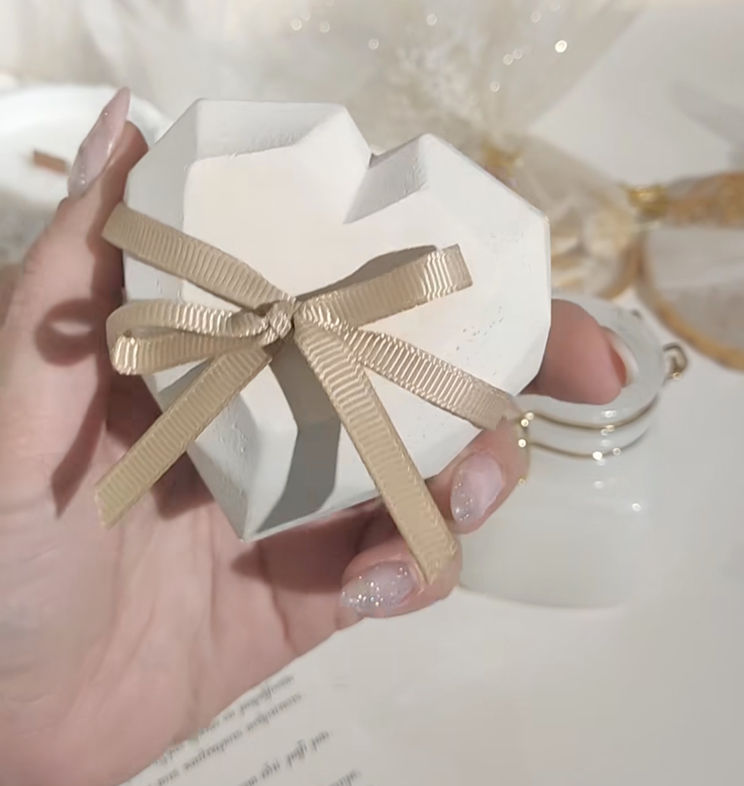 Μπομπονιέρα γάμου μπιζουτιέρα πορσελάνης πολύγωνη καρδιά σε λευκή απόχρωση και δέσιμο με γκρό κορδέλα σε γήινη απόχρωση.