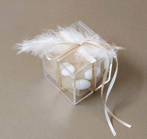 Μπομπονιέρα γάμου plexi glass κουτί με περίτεχνο δέσιμο.