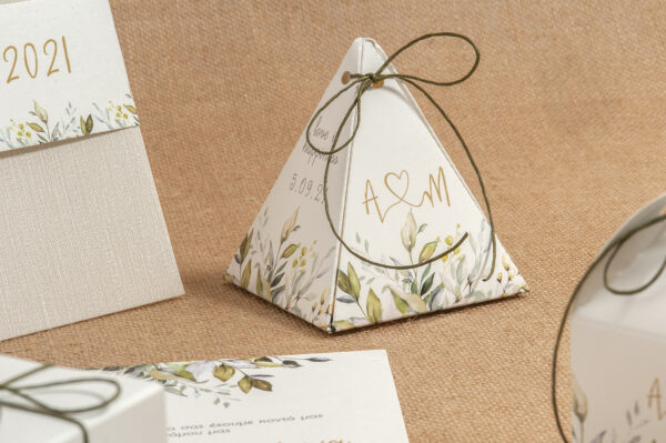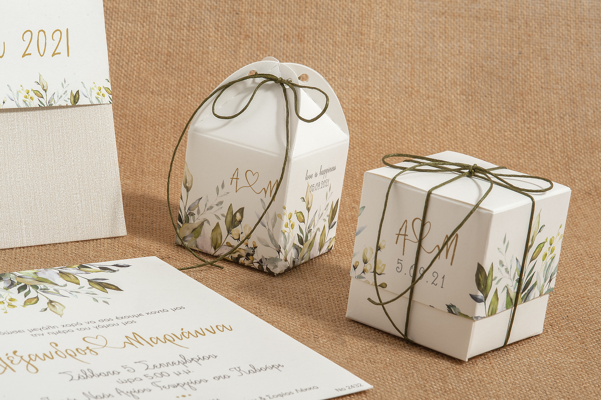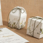 Ολοκληρωμένη πρόταση με διάφορες μπομπονιέρες και προσκλητήρια σε διάφορα μεγέθη και γραφικά με εντυπωσιακές εκτυπώσεις και περίτεχνα δεσίματα σε μοτίβο με θέμα την ελιά.