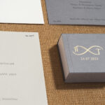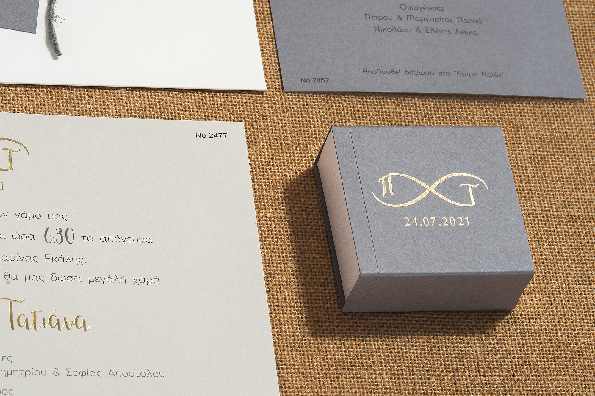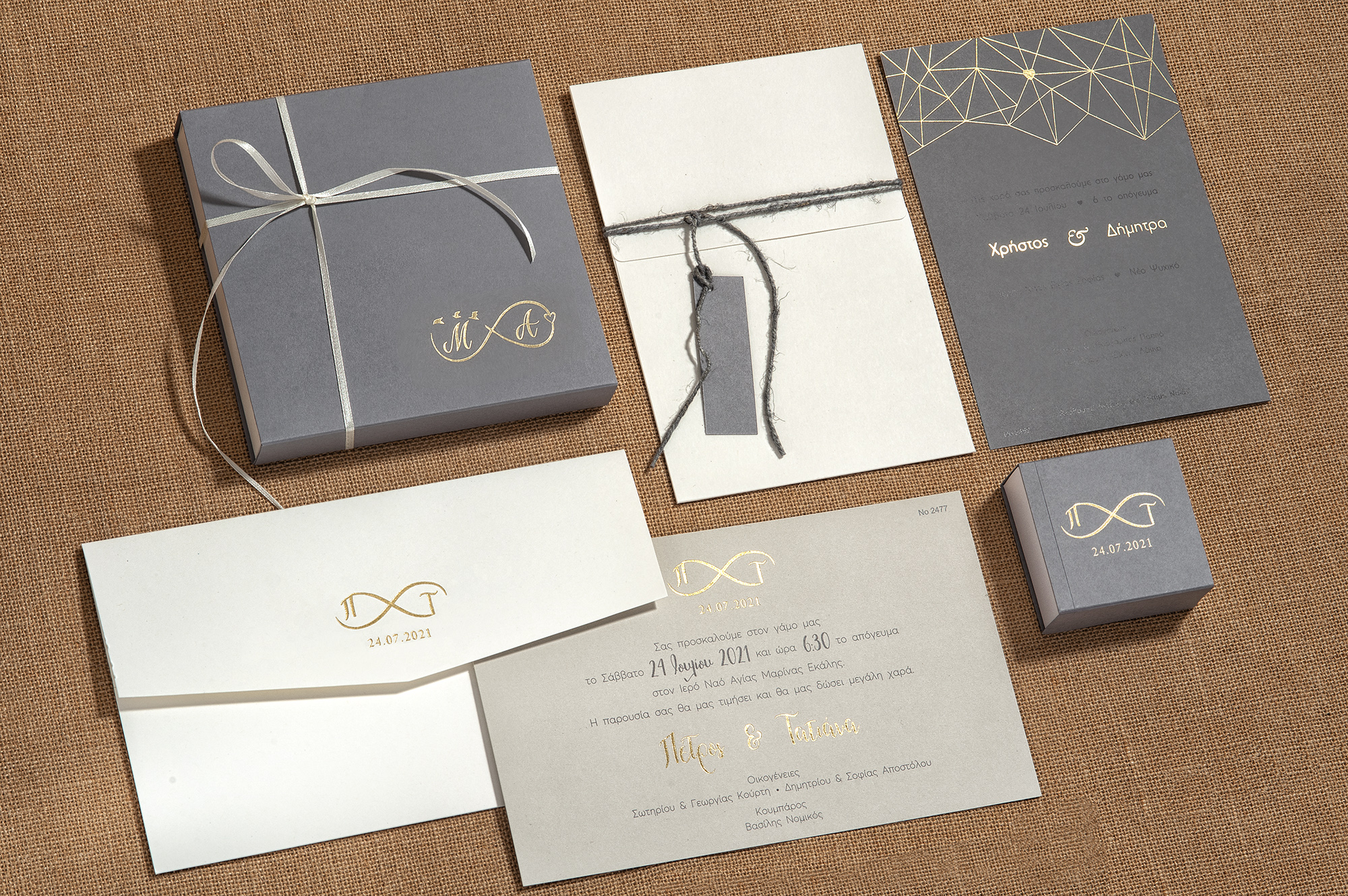 Ολοκληρωμένη πρόταση με διάφορες μπομπονιέρες και προσκλητήρια σε διάφορα μεγέθη και γραφικά με εντυπωσιακές εκτυπώσεις και περίτεχνα δεσίματα σε γήινες αποχρώσεις γκρί και ιβουάρ και χρυσές εκτυπώσεις.