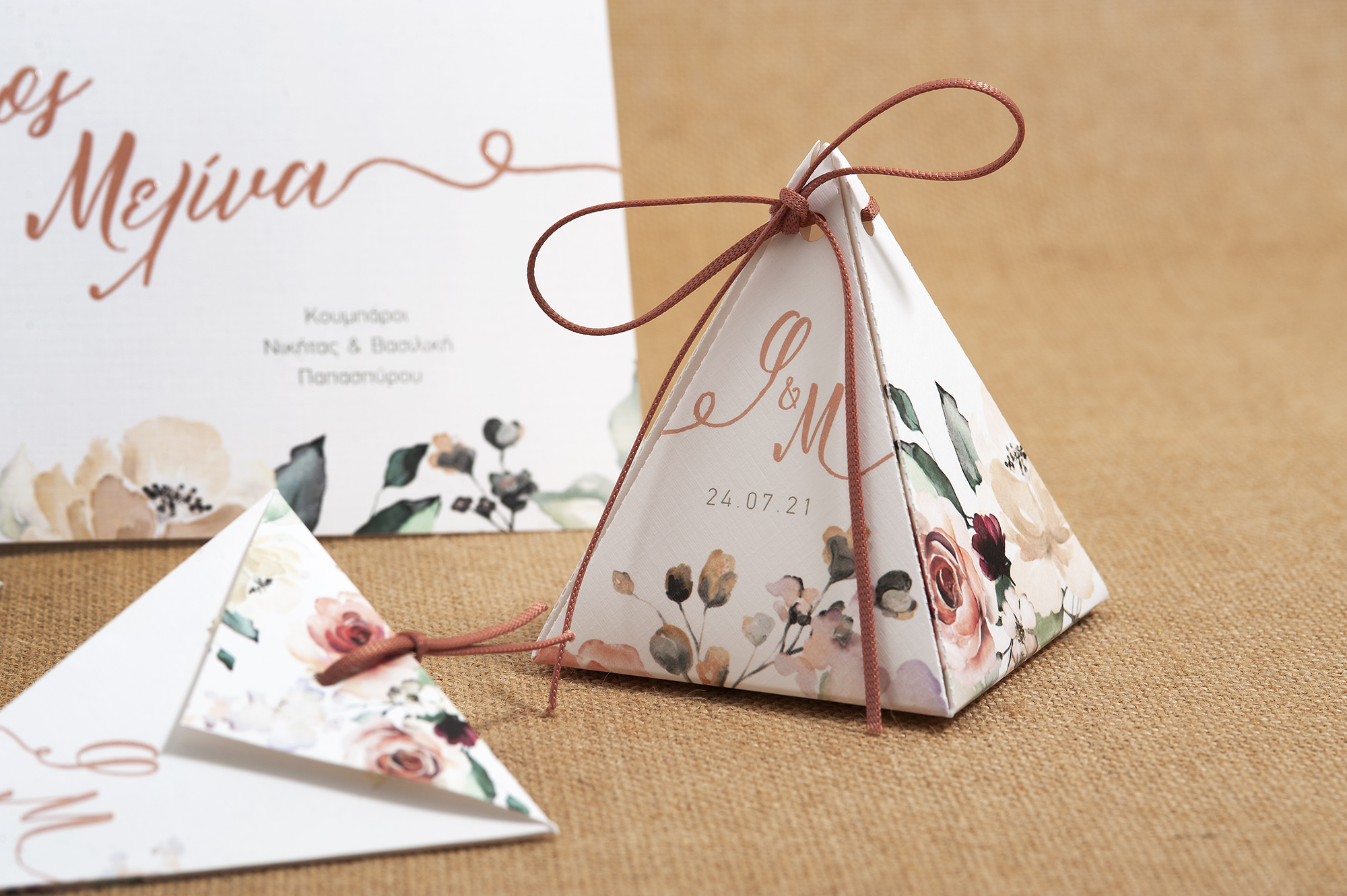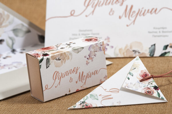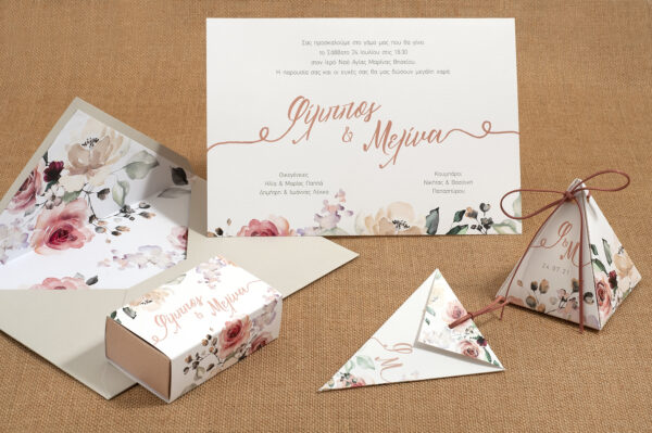 Ολοκληρωμένη πρόταση με διάφορες μπομπονιέρες και προσκλητήρια σε διάφορα μεγέθη και γραφικά με εντυπωσιακές εκτυπώσεις και περίτεχνα δεσίματα σε floral απόχρωση.