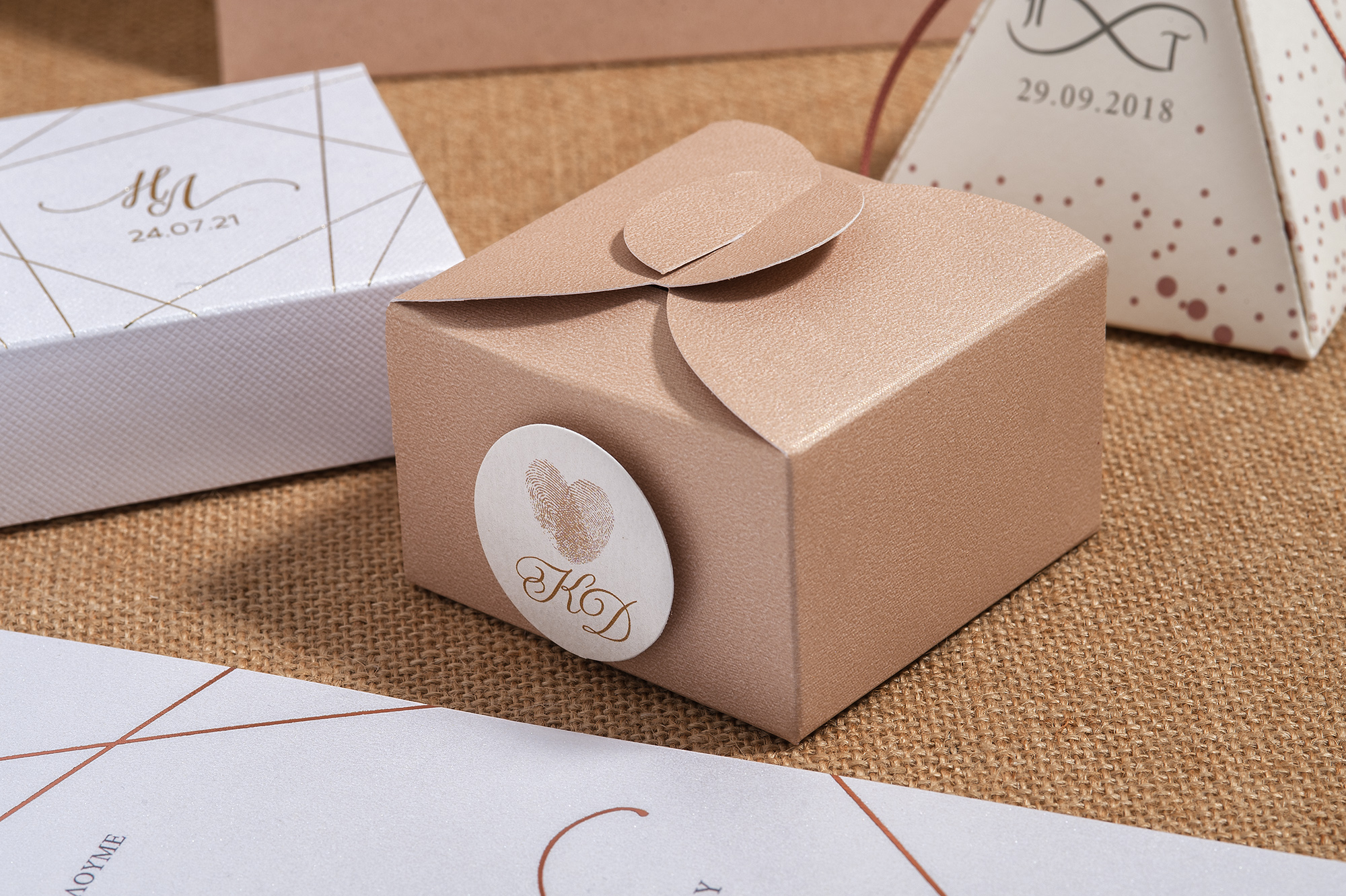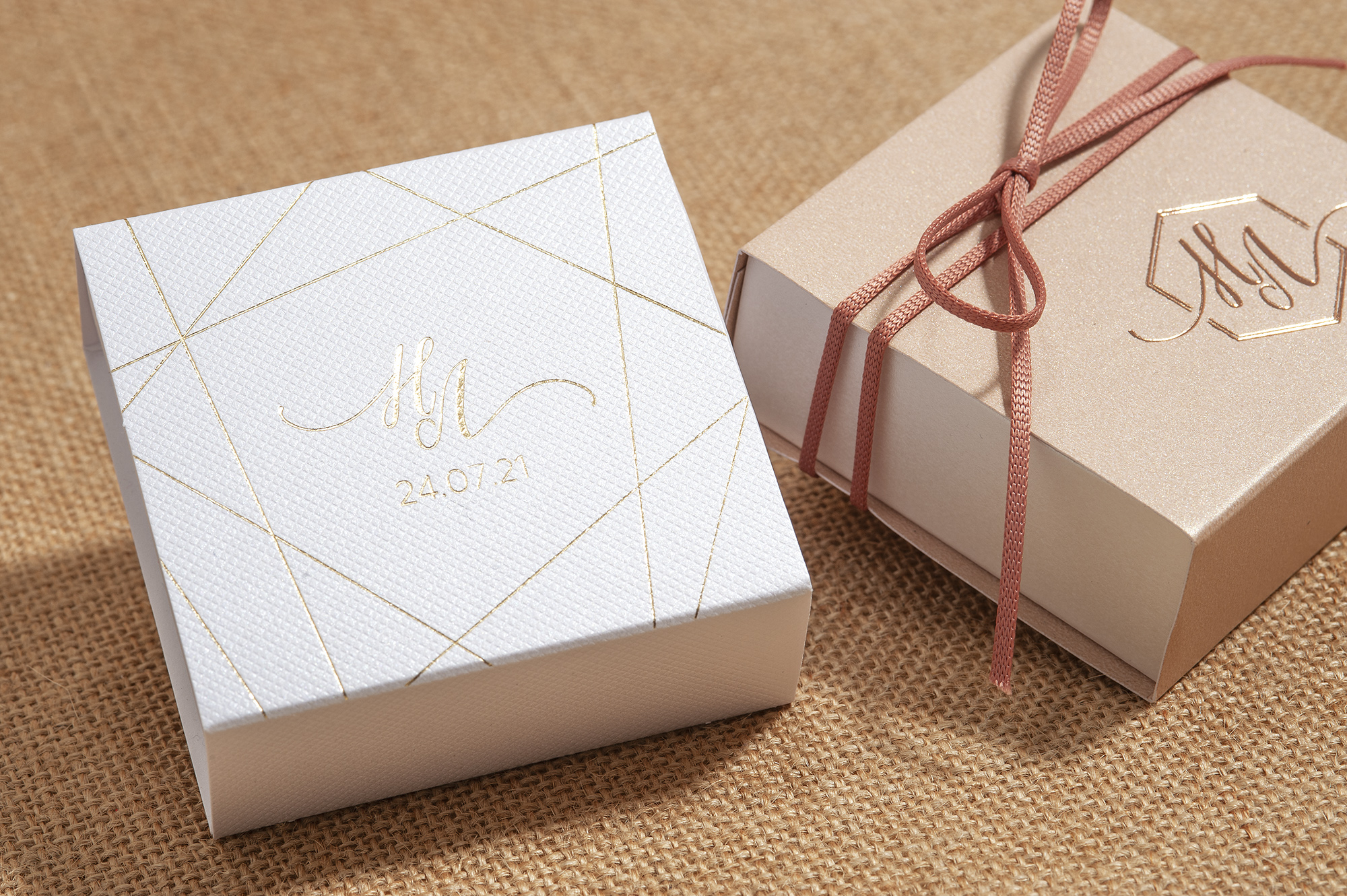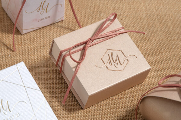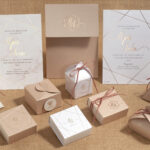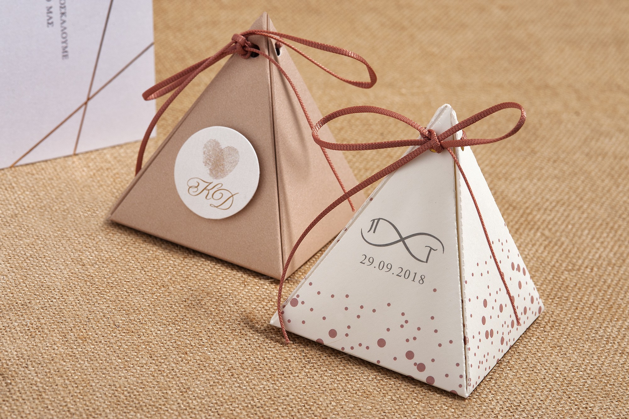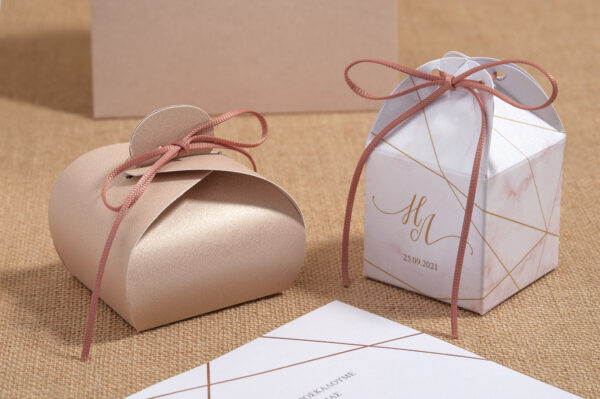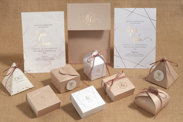 Ολοκληρωμένη πρόταση με διάφορες μπομπονιέρες και προσκλητήρια σε διάφορα μεγέθη και γραφικά με εντυπωσιακές εκτυπώσεις και περίτεχνα δεσίματα σε nude αποχρώσεις και rose gold και χρυσές εκτυπώσεις.