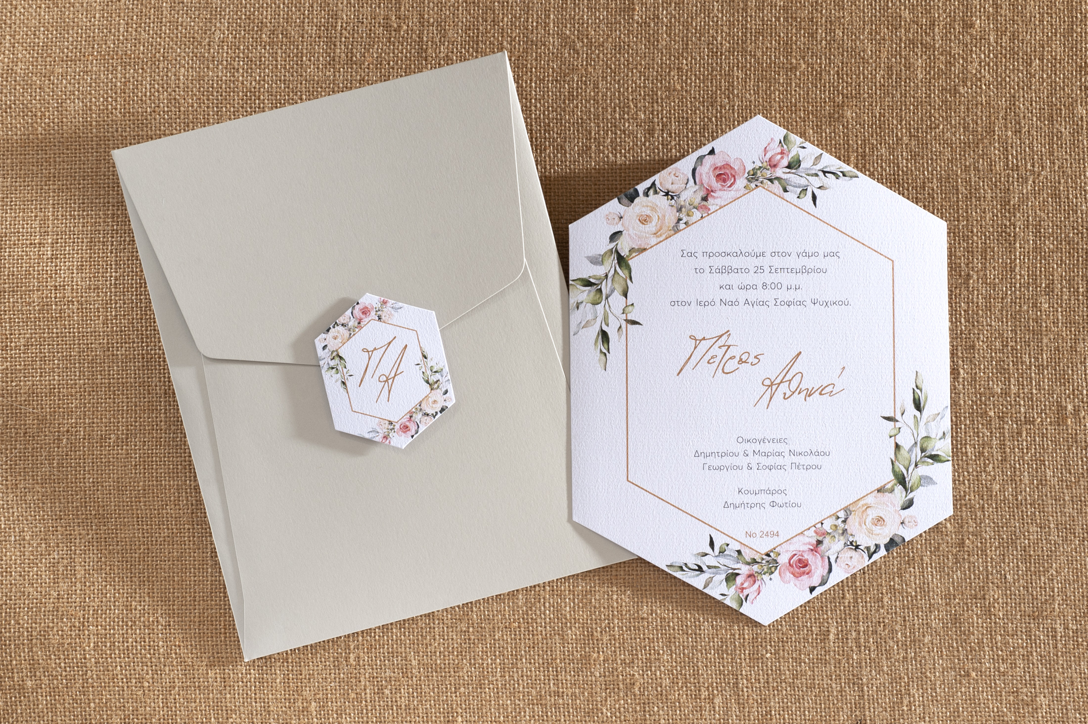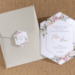 Πολύγωνο floral προσκλητήριο γάμου με εντυπωσιακό κοπτικό και χρωματισμούς.