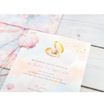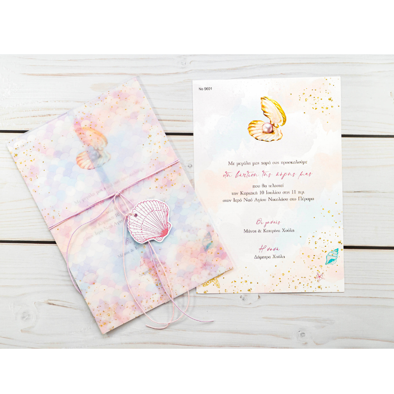 Προσκλητήριο βάπτισης με θέμα το κοχύλι και τυπωμένη διαφάνεια