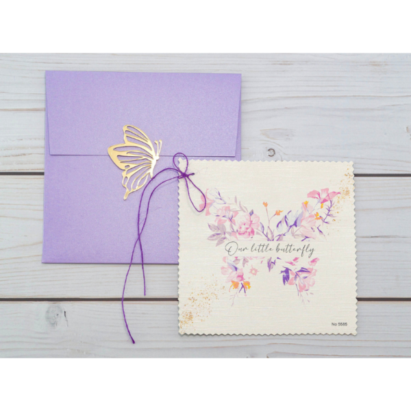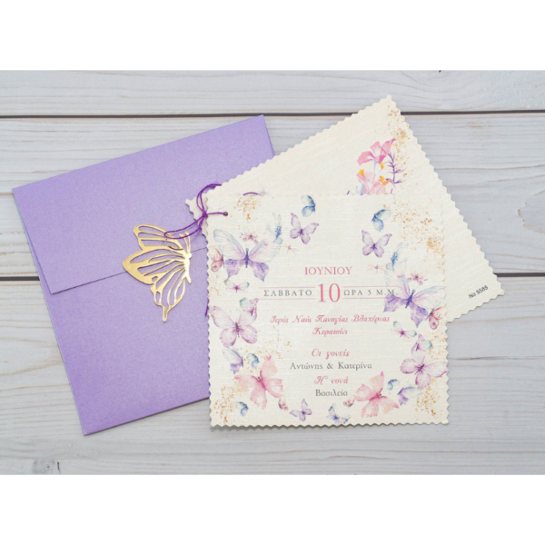 Προσκλητήριο βάπτισης σε λιλά απόχρωση με θέμα την πεταλούδα και χρυσή plexi glass πεταλούδα