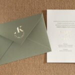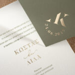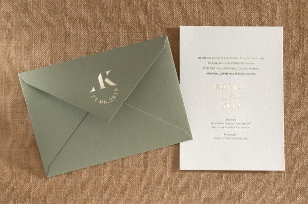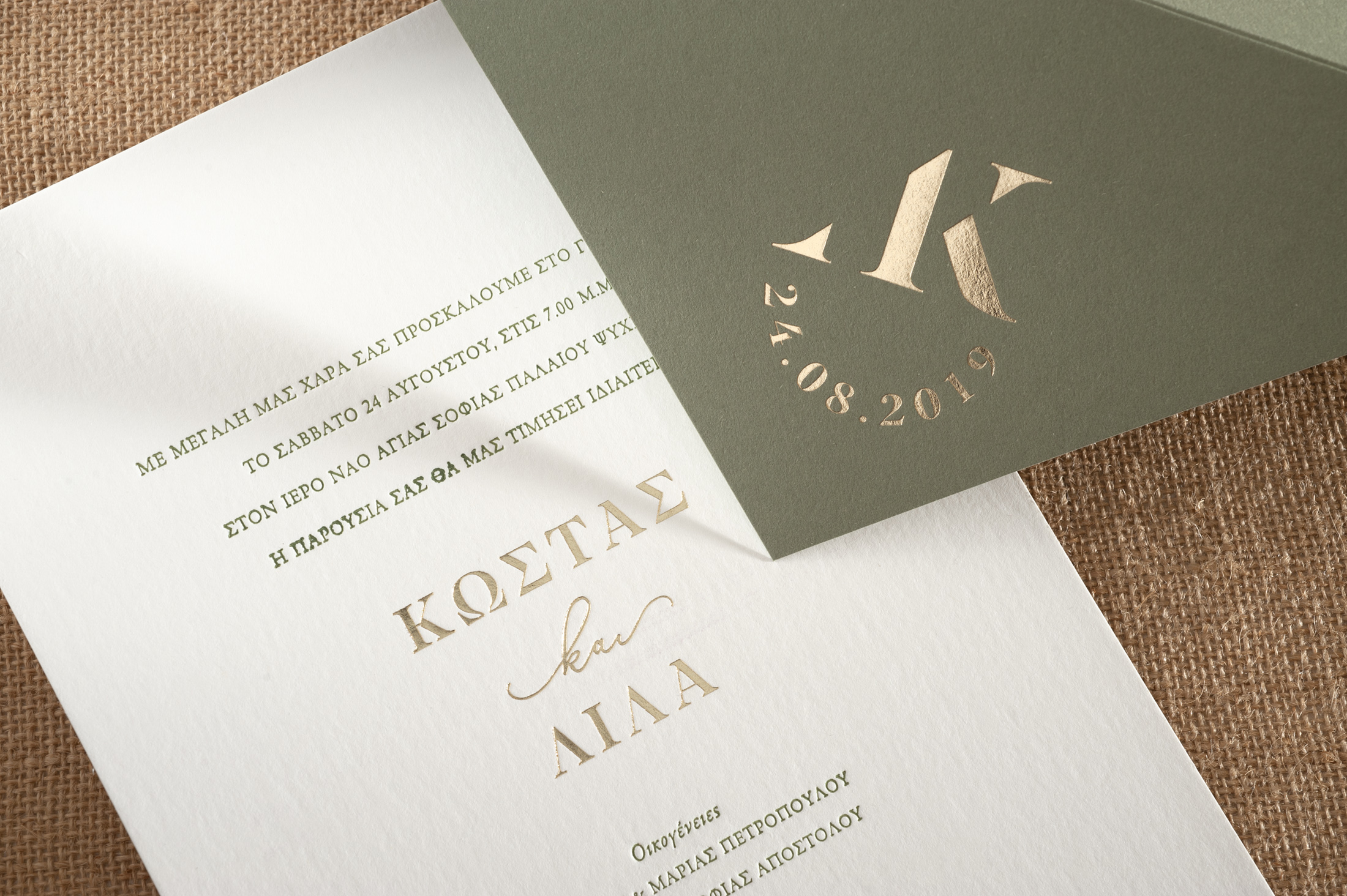 Προσκλητήριο γάμου με εντυπωσιακό λαδί φάκελο και ιδιαίτερα μονογράμματα και ιβουάρ βαμβακερή κάρτα στο εσωτερικό.
