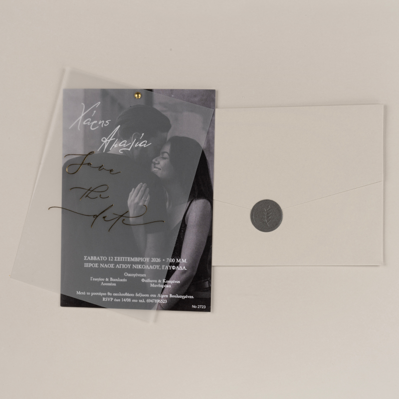 Προσκλητήριο γάμου με διαφάνεια και μεταλλικές λεπτομέρειες