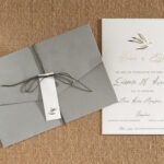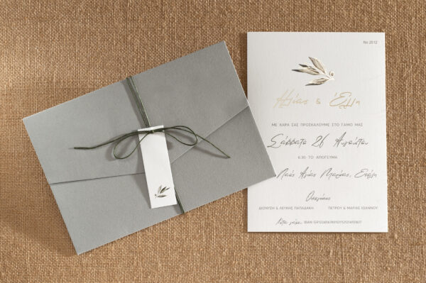 Προσκλητήριο γάμου με θέμα την ελιά και ιδιαίτερο χαρτί φακέλου με περίτεχνο δέσιμο.