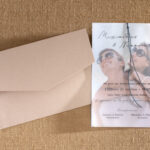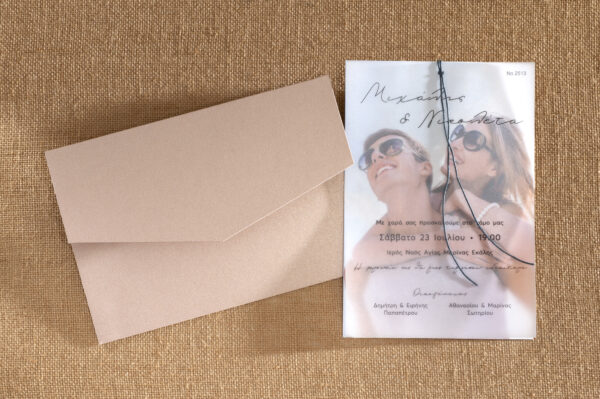 Προσκλητήριο γάμου με φωτογραφία του ζευγαριού και εξωτερική διαφάνεια.