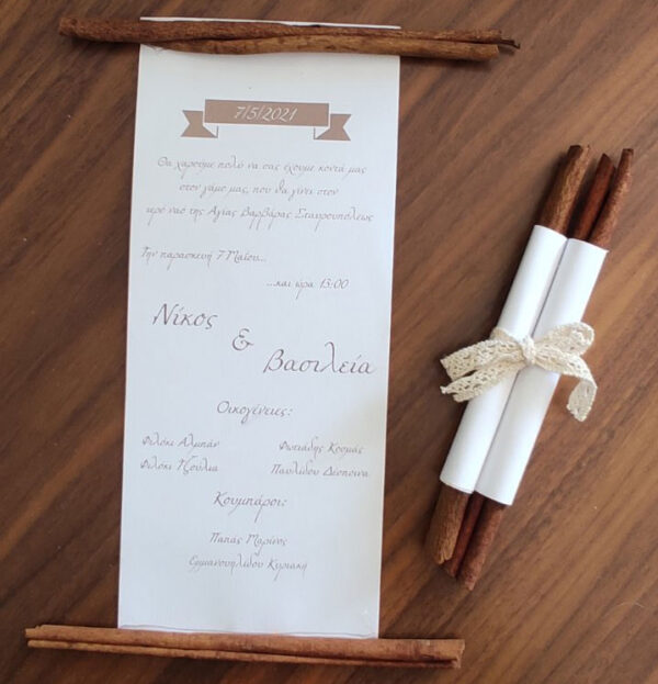 Στην τιμή περιλαμβάνεται το προσκλητήριο, η κανέλα και το δέσιμο.