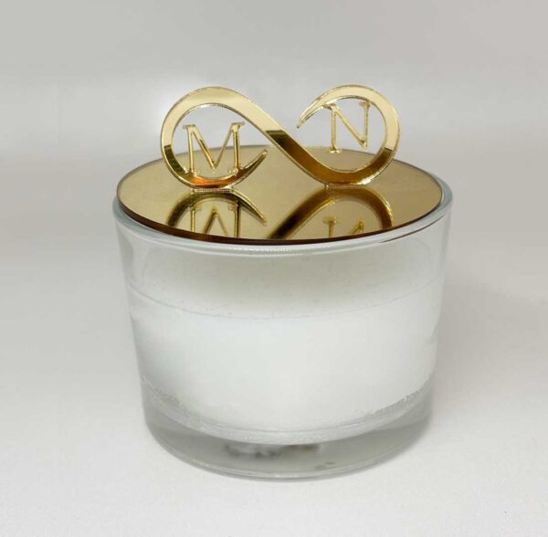 Μπομπονιέρα γάμου αρωματικό κερί με plexi glass καπάκι με κοπτικό το άπειρο και τα μονογράμματα του ζευγαριού. Η τιμή περιλαμβάνει 5 κουφέτα αμυγδάλου ή σοκολάτας και ΔΕΝ περιλαμβάνει το ΦΠΑ.