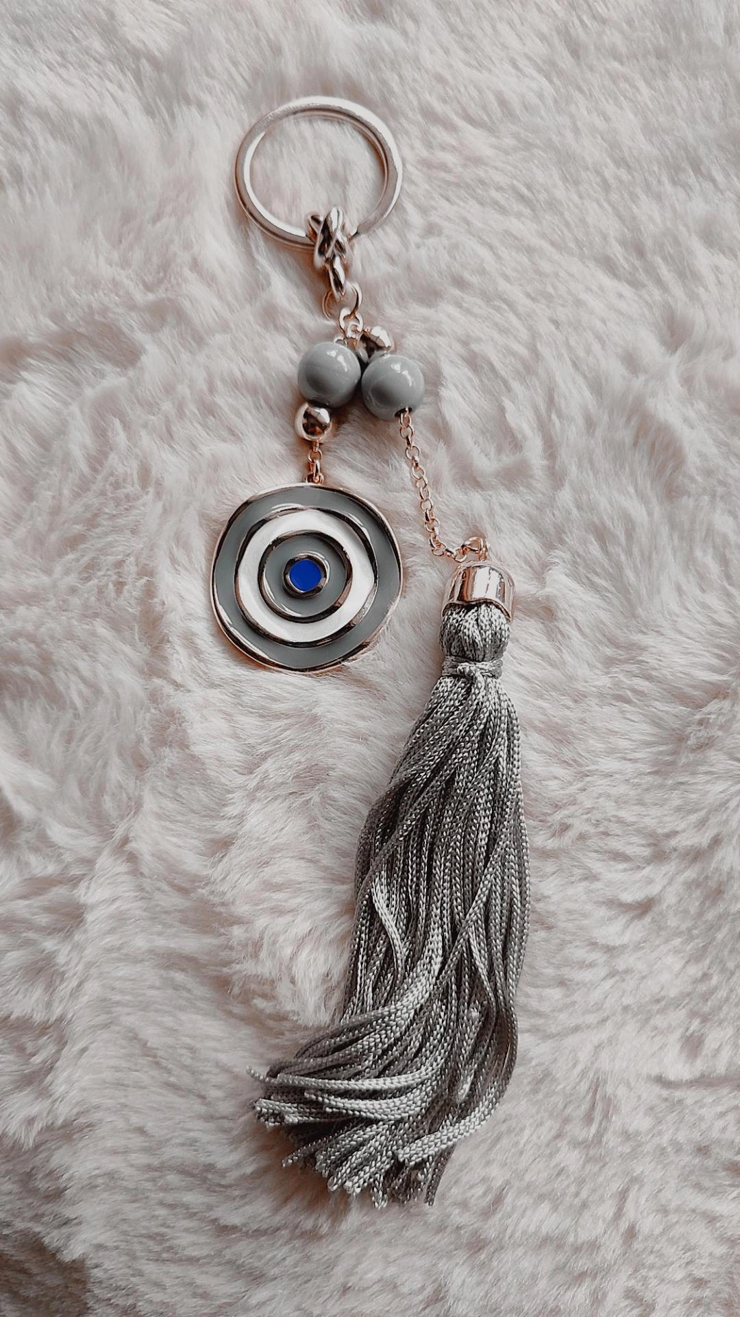 Χειροποίητο γούρι μπρελόκ από τη νέα μας luxury συλλογή ’25 μάτι σε χρυσή απόχρωση και γκρί σμάλτο με επιμετάλλωση 24 καρατίων με χειροποίητη φούντα σε γκρί και διακοσμητικές πέτρες.