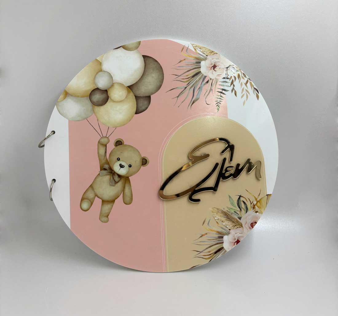 Μοντέρνο ευχολόγιο βάπτισης για κοριτσάκι με εξωτερικό τύπωμα και θέμα τα μπαλόνια και το αρκουδάκι και χρυσό plexi glass με το όνομα του παιδιού.