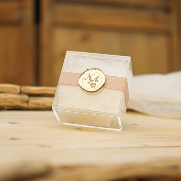 Μπομπονιέρα γάμου κουτάκι plexi glass με χρυσό καθρέφτη plexi glass στοιχείο.