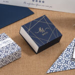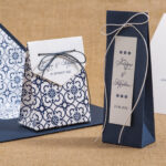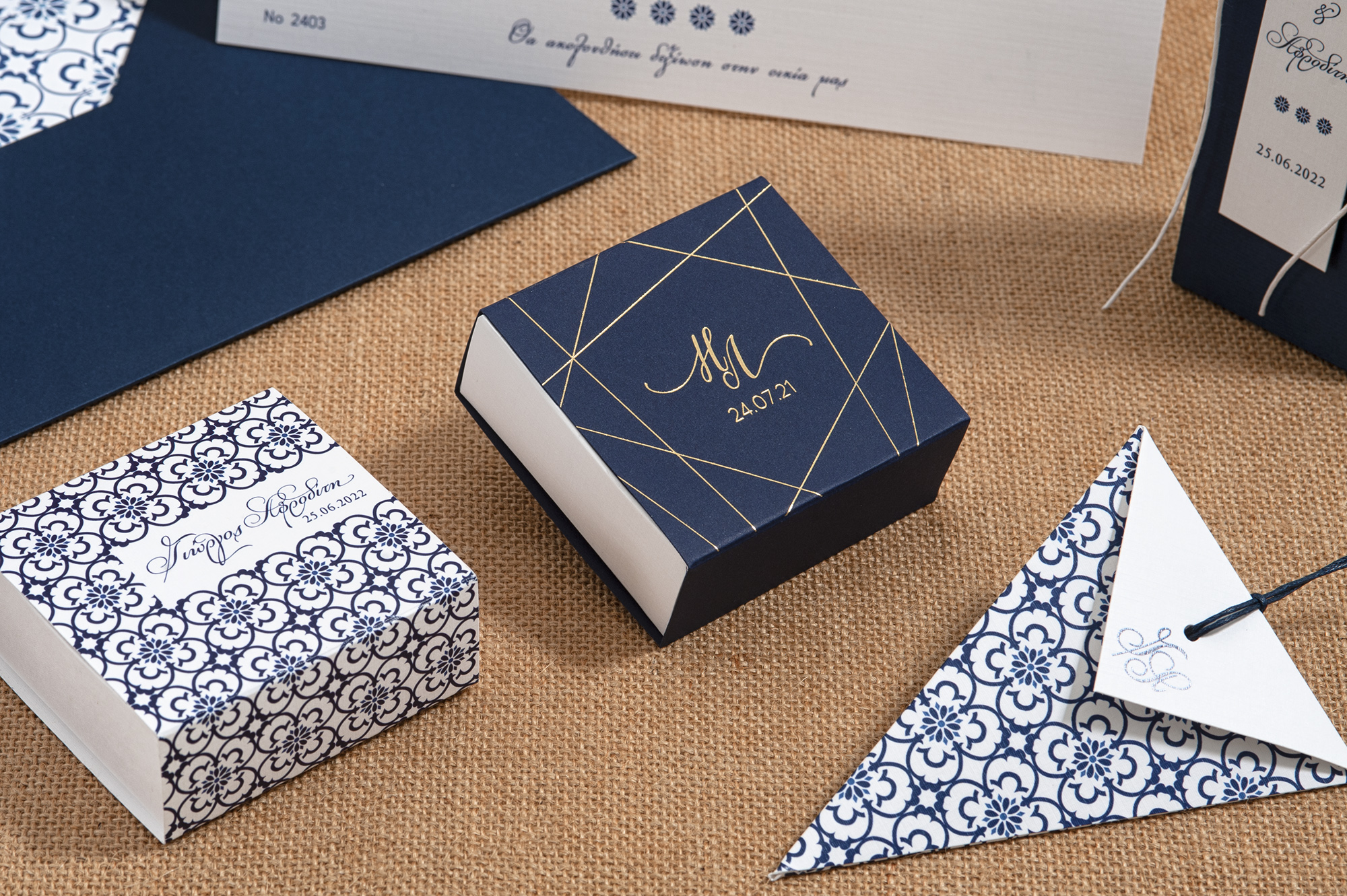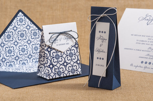 Ολοκληρωμένη πρόταση με διάφορες μπομπονιέρες , προσκλητήρια και χωνάκι ρυζιού σε διάφορα μεγέθη και γραφικά με εντυπωσιακές εκτυπώσεις και περίτεχνα δεσίματα σε blue navy και gold απόχρωση.