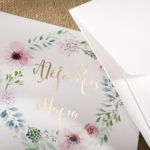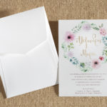 Προσκλητήριο γάμου με στεφάνι floral σε πολύχρωμα μοτίβα.